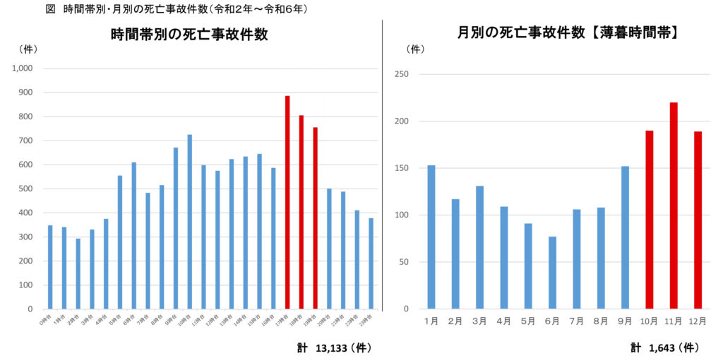 令和2年〜6年の5年間で発生した死亡事故を時間帯別に見ると(下図)、日没時刻に当たる17時台〜19時台が特に多いことが分かります。
