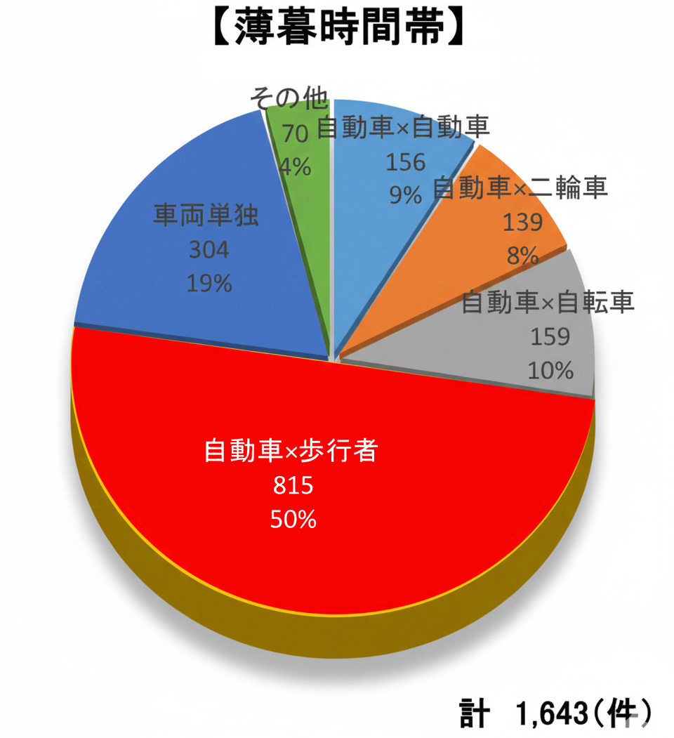 また、薄暮時間帯に発生した死亡事故を当事者別に分類したデータでは、「自動車と歩行者」の関係による事故が約半数を占めています。